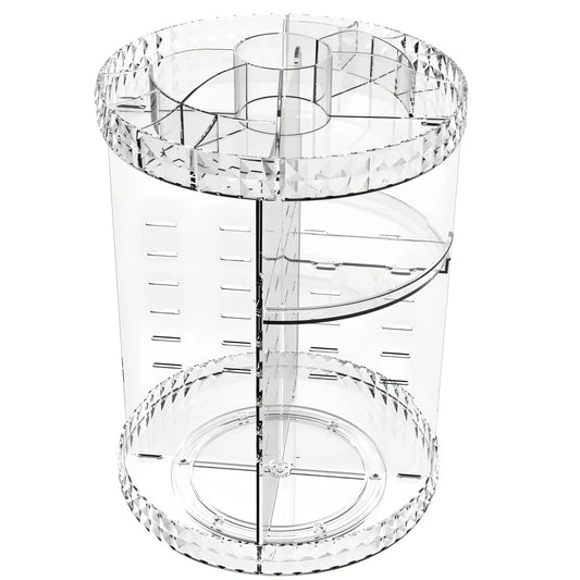Rotating cosmetics storage rack with 360-degree rotation and large capacity organisation for skincare products, featuring transparent design and multiple style options including diamond pattern, smooth surface, and flat top configurations
