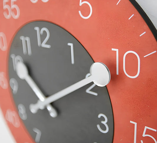 Round decorative wall clock with a 30cm diameter, featuring a vibrant multi-colour design in blue, green, grey, orange, red, or yellow to add a focal point to your room decor