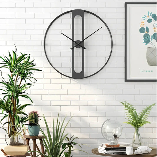 Round metal wall clock measuring 50cm diameter with silent quartz movement requiring one AA carbon battery for precise timekeeping in home or office settings