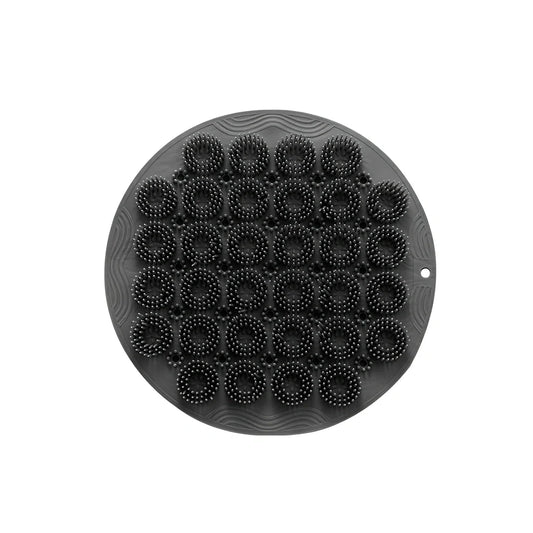 Silicone back bath brush with suction cup feet measuring 30x30cm that reaches difficult areas while staying securely positioned on shower walls during use