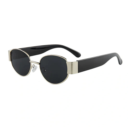 Small frame round sunglasses with UV400 protection featuring metal-reinforced plastic construction in six colour combinations including gold frame with grey lenses