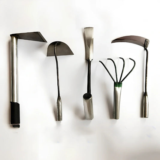 Small Sickle Four-tooth Rake Shovel Hoe Garden Tool Set with 5 steel tools for garden and farm tasks, featuring durable steel construction and lightweight handling