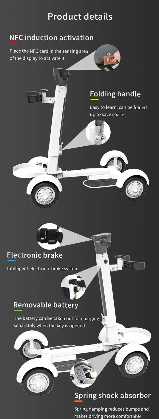 Four wheel electric folding golf scooter with 20km/h maximum speed and 10AH battery capacity for navigating lawn courses with stable four-wheel aluminium alloy construction