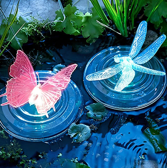 Solar LED float lamp with butterfly or dragonfly design provides 7 colour changing illumination for garden ponds and pools, automatically charging for 5 hours during daylight and lighting up at night with IP44 weather resistance rating